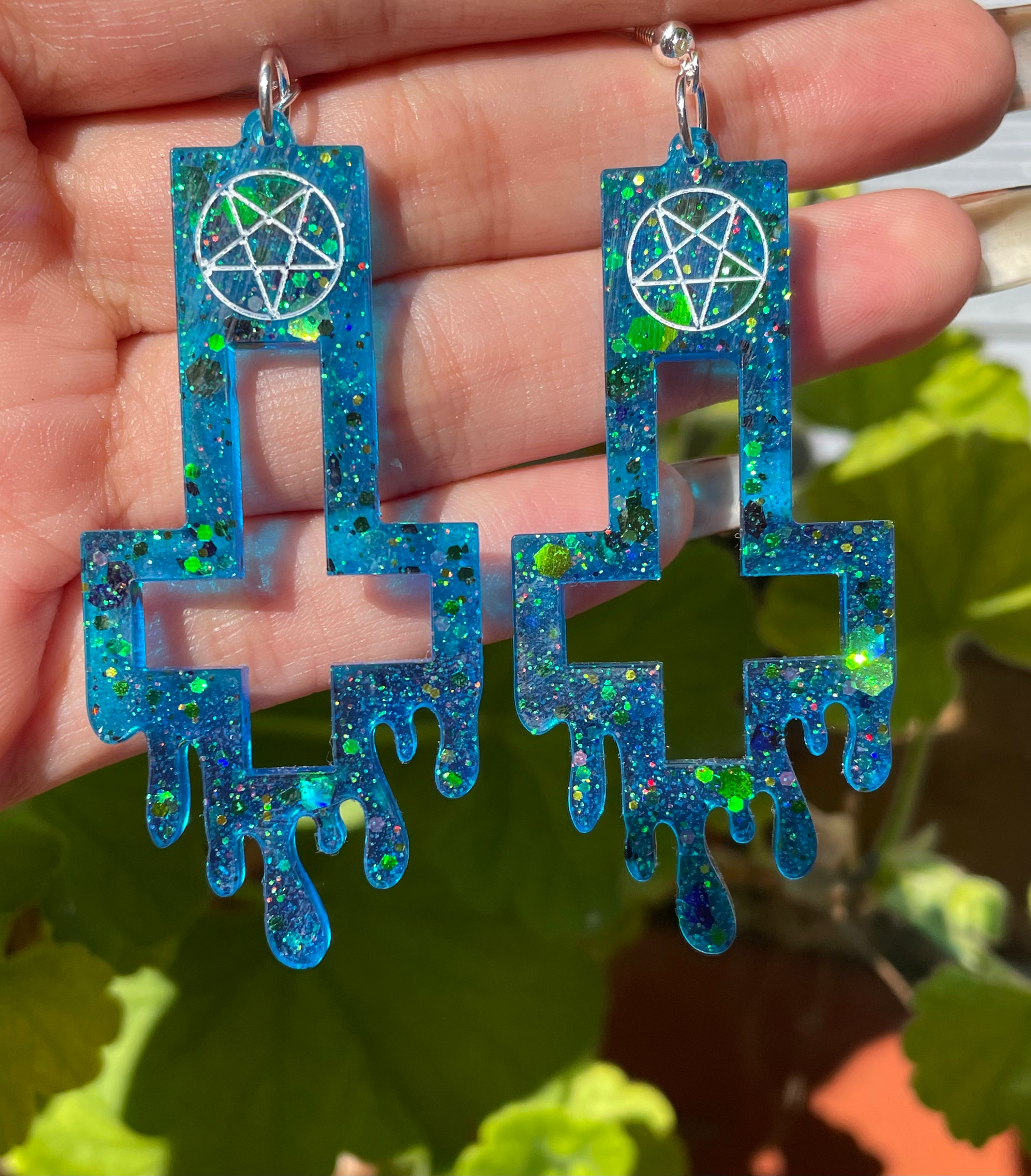 Add a huge statement to your outfit with our stunning blue dripping cross earrings