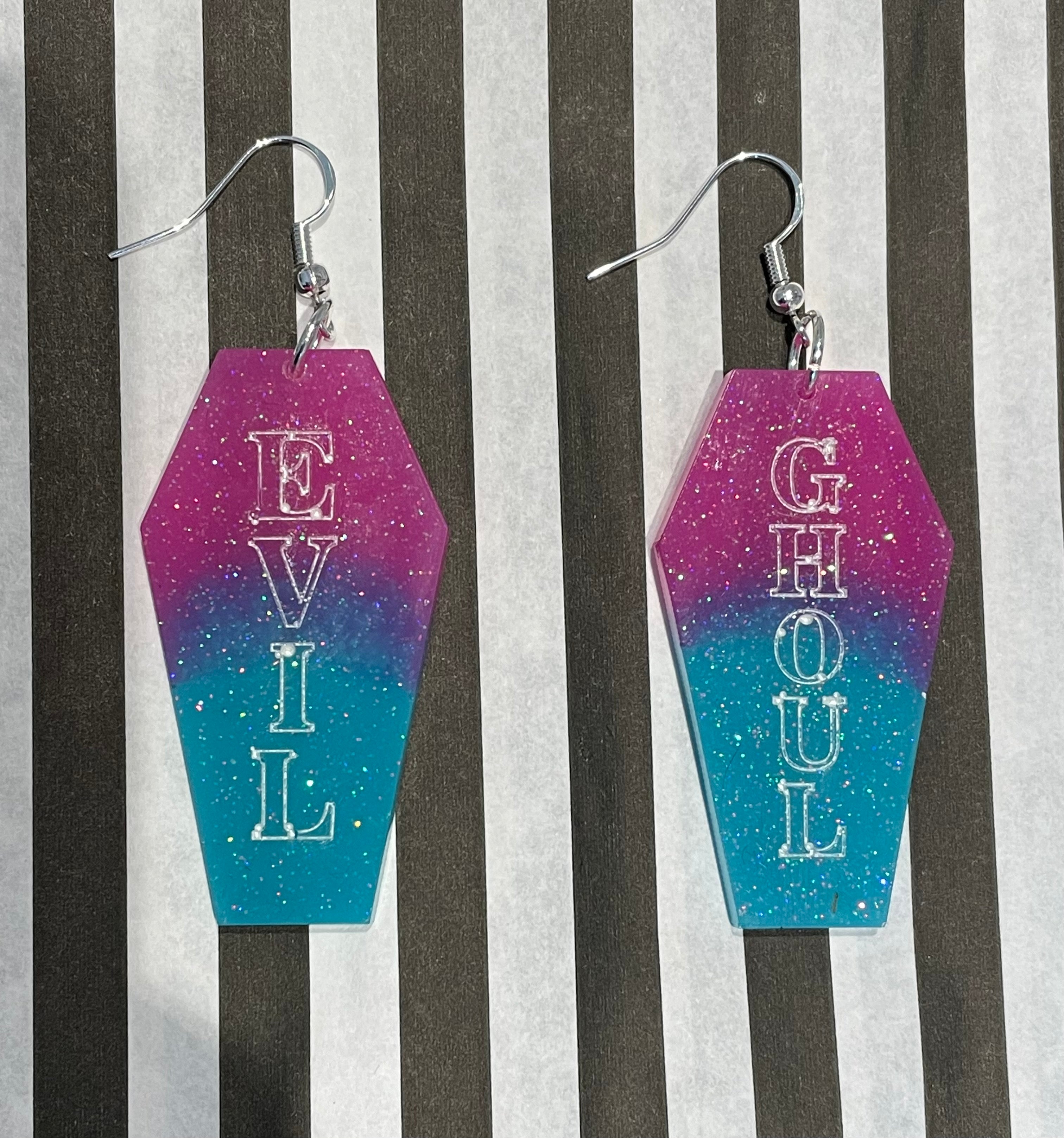 Add some colour to your outfit with these turquoise and fuchsia ombré glitter evil ghoul coffins !