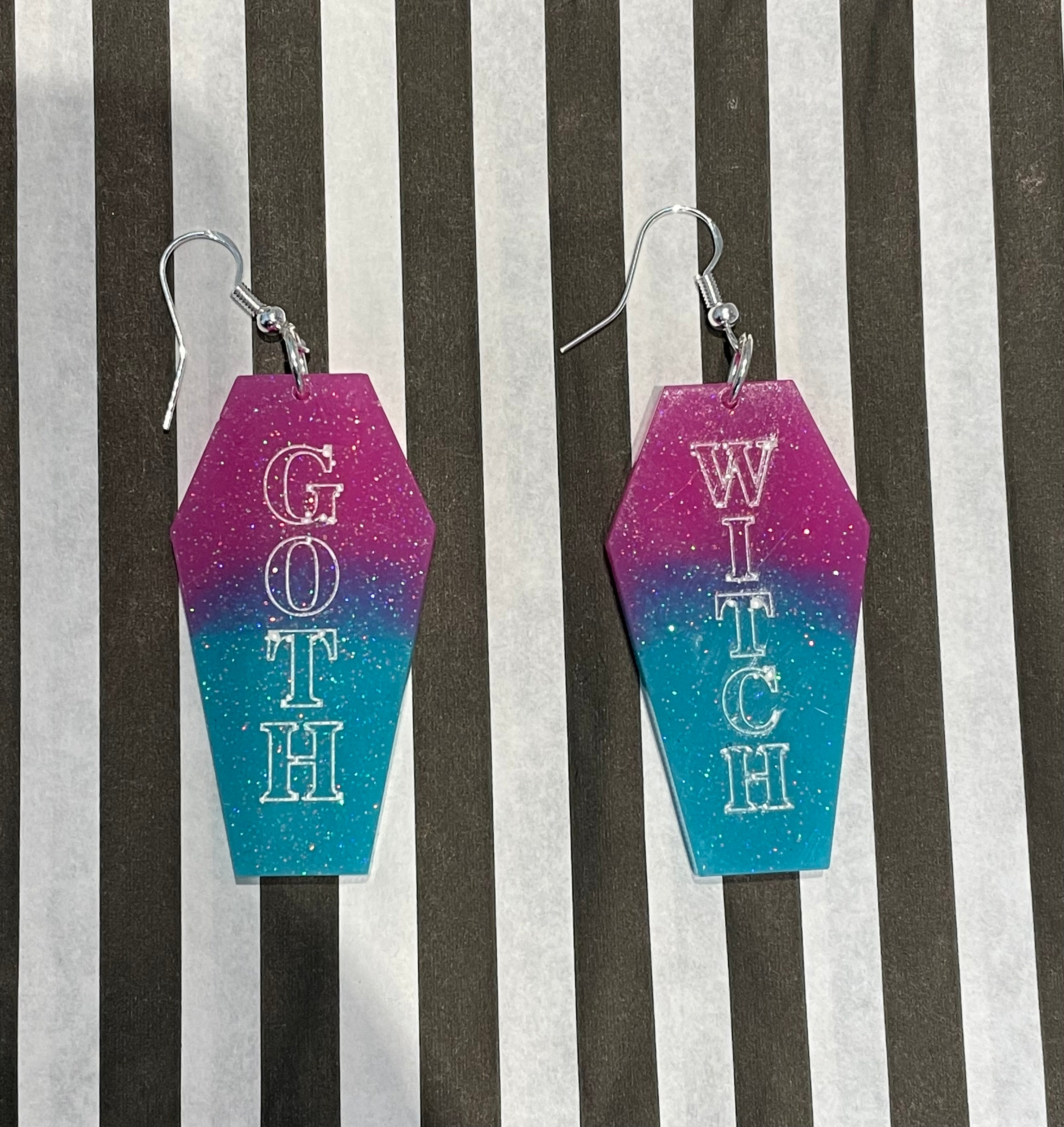 Add some colour to your outfit with these turquoise and fuchsia ombré glitter goth witch coffins !